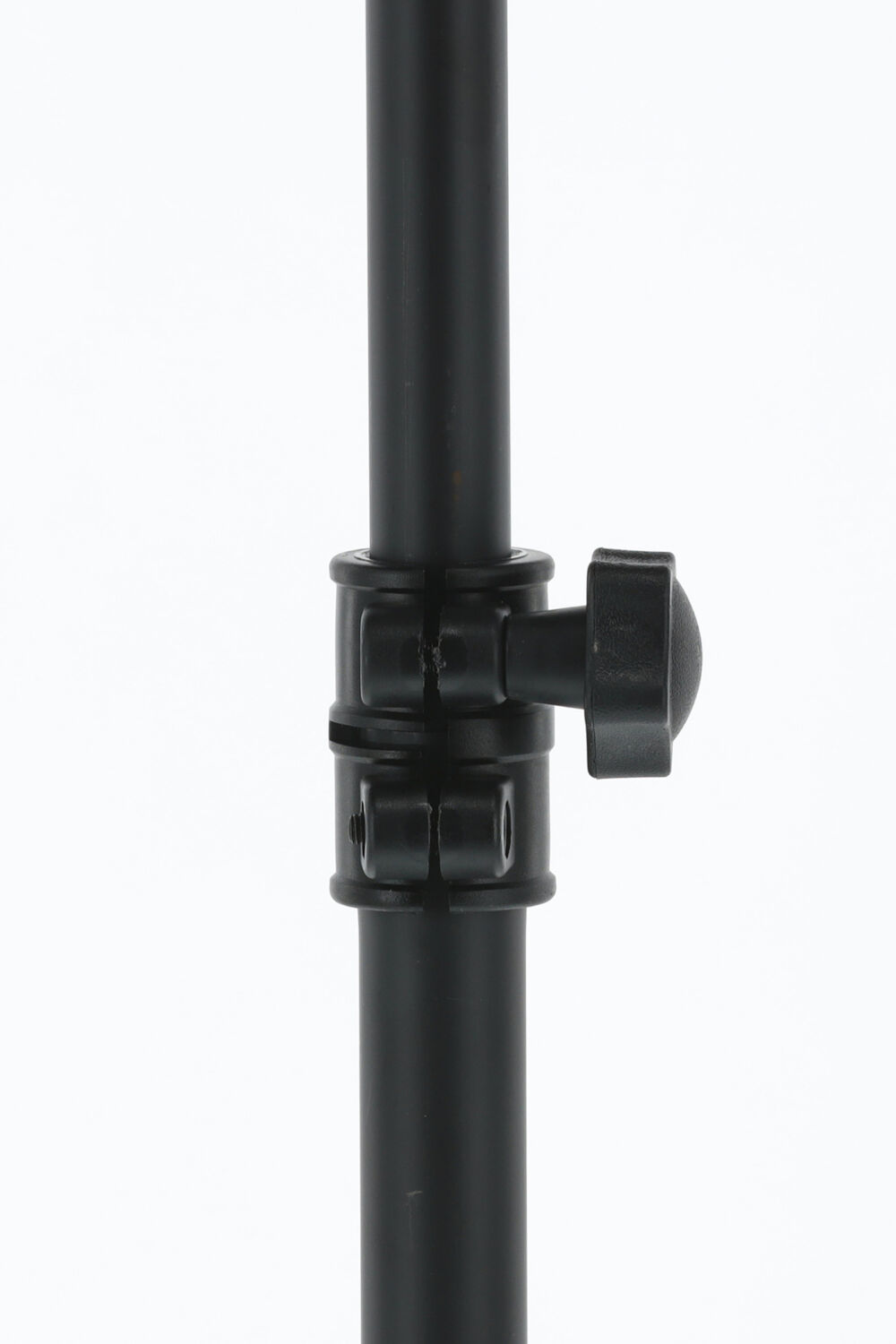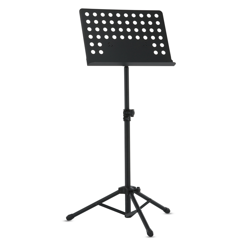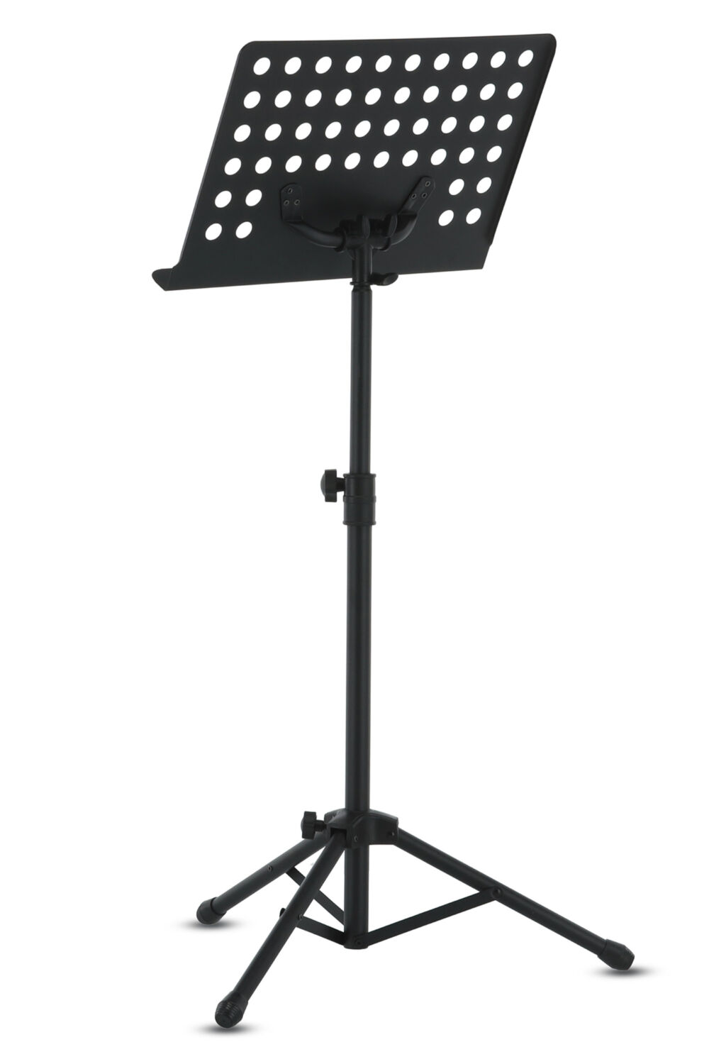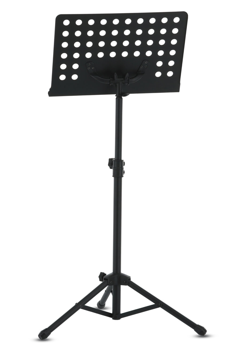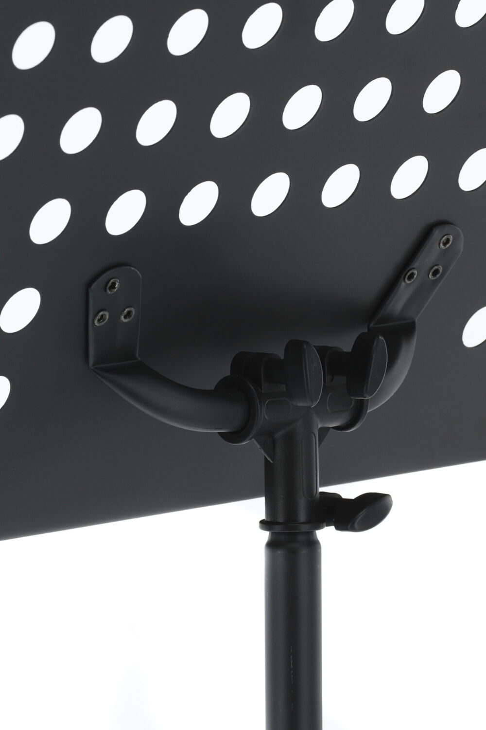 Fabricado en metal, este atril cuenta con un pupitre perforado desmontable, ligero pero estable, que permite colocar desde hojas sueltas hasta cuadernos o carpetas de música. Su sistema de unión por tubo y conectores de ABS asegura una estructura sólida y duradera incluso con uso intensivo.