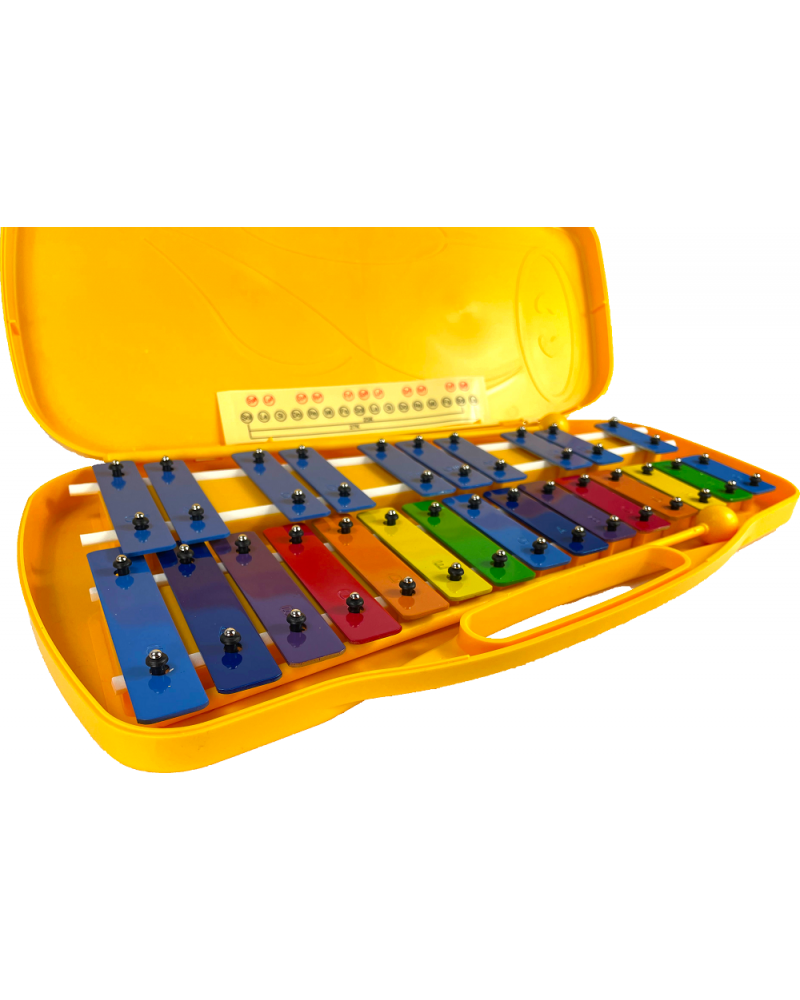 Las 25 teclas metálicas ofrecen un rango suficiente para tocar melodías completas, canciones educativas y ejercicios musicales. Su sonido claro y definido permite trabajar tanto lectura musical como percepción auditiva.