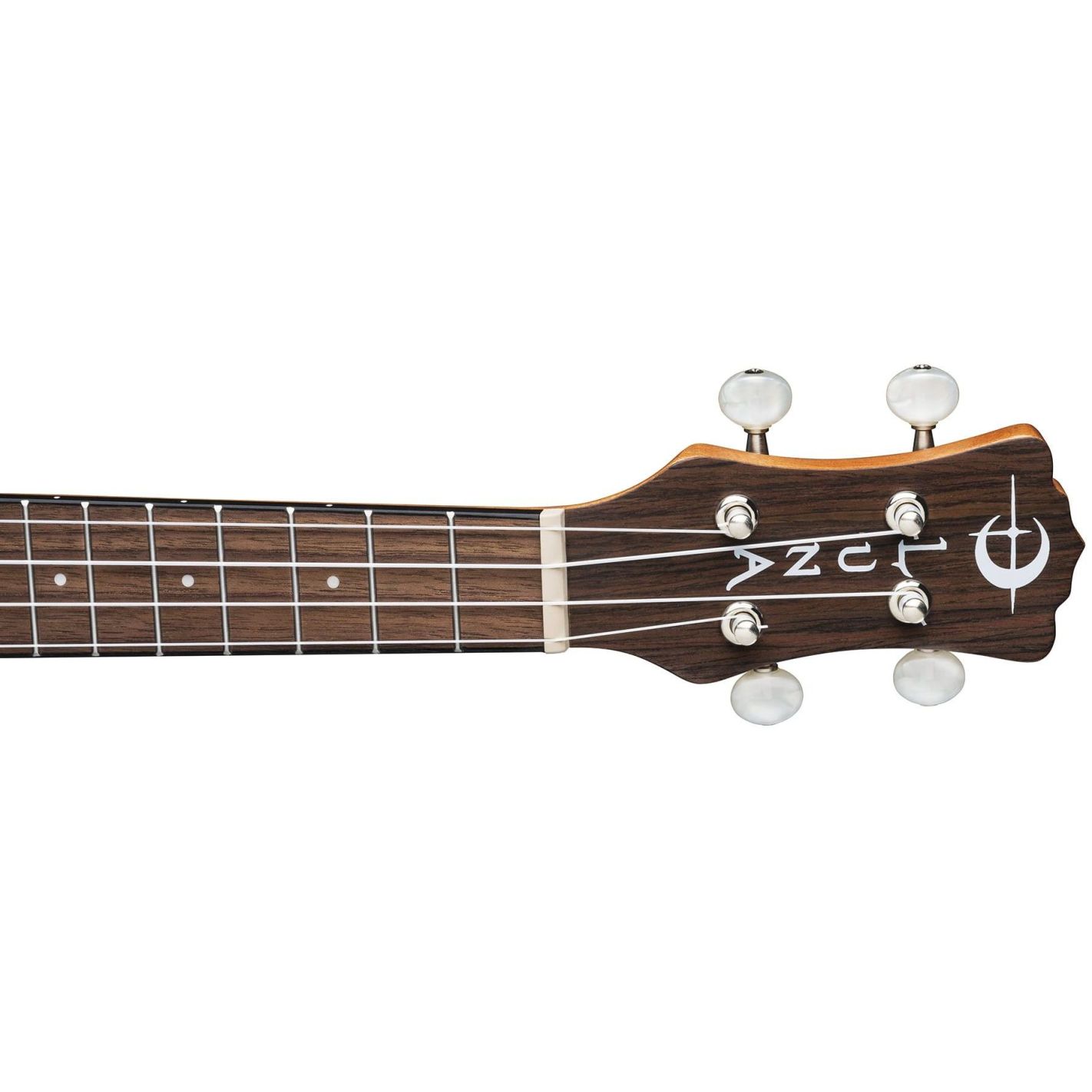 El Luna Tribal Concert es un ukelele tamaño concert con estética tribal inspirada en tallas del Pacífico: motivos geométricos en acabado Satin Natural sobre caoba oriental (cuerpo, tapa y mástil). Monta diapasón y puente de nogal, 19 trastes, escala de 15″ (381 mm), cejuela de 35 mm, clavijas abiertas con botones perlados y cuerdas Aquila Super Nylgut de serie. Es un modelo acústico (sin previo) pensado para estudio, directo microfoneado o aprendizaje, con construcción set-neck y herrajes en cromo.